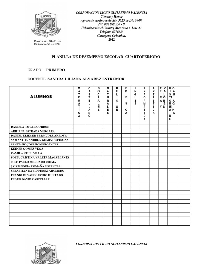 Planillas De Desempeno Escolar 1 2012