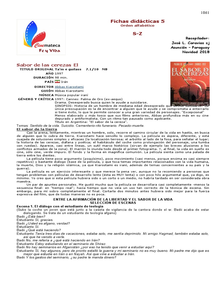 Fichas De Peliculas Formativas 5 Orden Alfabetico S Z Recopilador Jose L Caravias Sj Asuncion Paraguay Mayo 2013 Sabor De Las Cerezas El Titulo Original Ta M E Guilass 7 1 10 Mb Ano 1997 Duracion 98 Min Pais Iran Director Abbas